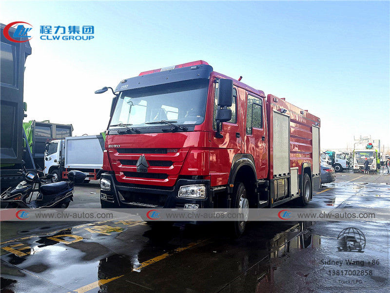 1) HOWO 4X2 fire fighting truck is composed with truck body and cabin,cabin is two rows,which can allow 6 persons.The front part of truck body is equipment room,middle is water tank and foam tank,rear is pump room.